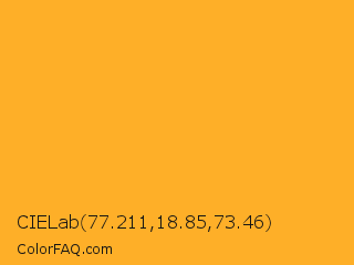 CIELab 77.211,18.85,73.46 Color is a normal orange color and the nearest color is My Sin #ffb31f. Hex code #feaf28 and RGB value is rgb(254,175,40). In RGB color space, this color is composed of 100% red, 69% green, 16% blue, In CMYK color space, this color is composed of 0% cyan, 31% magenta, 84% yellow , 0% black , In HSL color space, this color has a hue angle of 38° , 99% saturation and 58% lightness.