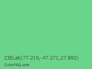 CIELab 77.219,-47.271,27.892 Color is a light green color and the nearest color is Very Light Malachite Green #64e986. Hex code #69d489 and RGB value is rgb(105,212,137). In RGB color space, this color is composed of 41% red, 83% green, 54% blue, In CMYK color space, this color is composed of 50% cyan, 0% magenta, 35% yellow , 17% black , In HSL color space, this color has a hue angle of 138° , 55% saturation and 62% lightness.