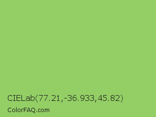 CIELab 77.21,-36.933,45.82 Color is a light green color and the nearest color is Pistachio #93c572. Hex code #94cf66 and RGB value is rgb(148,207,102). In RGB color space, this color is composed of 58% red, 81% green, 40% blue, In CMYK color space, this color is composed of 29% cyan, 0% magenta, 51% yellow , 19% black , In HSL color space, this color has a hue angle of 94° , 52% saturation and 61% lightness.