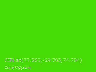 CIELab 77.265,-69.792,74.734 Color is a normal green color and the nearest color is Harlequin Green #46cb18. Hex code #46db04 and RGB value is rgb(70,219,4). In RGB color space, this color is composed of 27% red, 86% green, 2% blue, In CMYK color space, this color is composed of 68% cyan, 0% magenta, 98% yellow , 14% black , In HSL color space, this color has a hue angle of 102° , 96% saturation and 44% lightness.