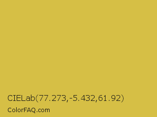 CIELab 77.273,-5.432,61.92 Color is a normal yellow color and the nearest color is Turmeric #cabb48. Hex code #d6bf45 and RGB value is rgb(214,191,69). In RGB color space, this color is composed of 84% red, 75% green, 27% blue, In CMYK color space, this color is composed of 0% cyan, 11% magenta, 68% yellow , 16% black , In HSL color space, this color has a hue angle of 50° , 64% saturation and 55% lightness.