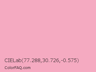 CIELab 77.288,30.726,-0.575 Color is a very light rose color and the nearest color is Nadeshiko Pink #f6adc6. Hex code #f5aac1 and RGB value is rgb(245,170,193). In RGB color space, this color is composed of 96% red, 67% green, 76% blue, In CMYK color space, this color is composed of 0% cyan, 31% magenta, 21% yellow , 4% black , In HSL color space, this color has a hue angle of 342° , 79% saturation and 81% lightness.
