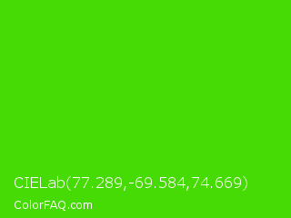 CIELab 77.289,-69.584,74.669 Color is a normal green color and the nearest color is Harlequin Green #46cb18. Hex code #47db05 and RGB value is rgb(71,219,5). In RGB color space, this color is composed of 28% red, 86% green, 2% blue, In CMYK color space, this color is composed of 68% cyan, 0% magenta, 98% yellow , 14% black , In HSL color space, this color has a hue angle of 101° , 96% saturation and 44% lightness.