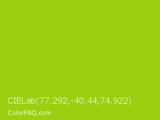 CIELab 77.292,-40.44,74.922 Color is a normal lime color and the nearest color is Bahia #a5cb0c. Hex code #9ad010 and RGB value is rgb(154,208,16). In RGB color space, this color is composed of 60% red, 82% green, 6% blue, In CMYK color space, this color is composed of 26% cyan, 0% magenta, 92% yellow , 18% black , In HSL color space, this color has a hue angle of 77° , 86% saturation and 44% lightness.