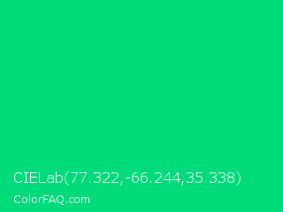 CIELab 77.322,-66.244,35.338 Color is a normal green color and the nearest color is Caribbean Green #00cc99. Hex code #00db7a and RGB value is rgb(0,219,122). In RGB color space, this color is composed of 0% red, 86% green, 48% blue, In CMYK color space, this color is composed of 100% cyan, 0% magenta, 44% yellow , 14% black , In HSL color space, this color has a hue angle of 153° , 100% saturation and 43% lightness.