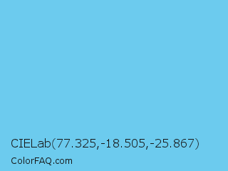 CIELab 77.325,-18.505,-25.867 Color is a light blue color and the nearest color is Sky Blue #76d7ea. Hex code #6ccbee and RGB value is rgb(108,203,238). In RGB color space, this color is composed of 42% red, 80% green, 93% blue, In CMYK color space, this color is composed of 55% cyan, 15% magenta, 0% yellow , 7% black , In HSL color space, this color has a hue angle of 196° , 79% saturation and 68% lightness.
