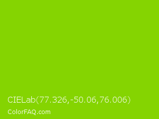 CIELab 77.326,-50.06,76.006 Color is a normal green color and the nearest color is Sheen Green #8fd400. Hex code #85d401 and RGB value is rgb(133,212,1). In RGB color space, this color is composed of 52% red, 83% green, 0% blue, In CMYK color space, this color is composed of 37% cyan, 0% magenta, 100% yellow , 17% black , In HSL color space, this color has a hue angle of 82° , 99% saturation and 42% lightness.