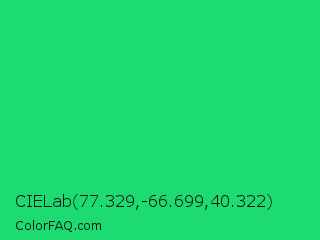 CIELab 77.329,-66.699,40.322 Color is a normal green color and the nearest color is UFO Green #3cd070. Hex code #1cdb70 and RGB value is rgb(28,219,112). In RGB color space, this color is composed of 11% red, 86% green, 44% blue, In CMYK color space, this color is composed of 87% cyan, 0% magenta, 49% yellow , 14% black , In HSL color space, this color has a hue angle of 146° , 77% saturation and 48% lightness.