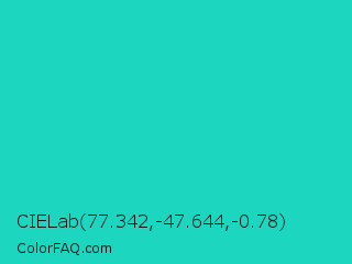 CIELab 77.342,-47.644,-0.78 Color is a normal cyan color and the nearest color is Java #1fc2c2. Hex code #1cd6bf and RGB value is rgb(28,214,191). In RGB color space, this color is composed of 11% red, 84% green, 75% blue, In CMYK color space, this color is composed of 87% cyan, 0% magenta, 11% yellow , 16% black , In HSL color space, this color has a hue angle of 173° , 77% saturation and 47% lightness.