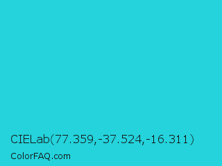 CIELab 77.359,-37.524,-16.311 Color is a normal cyan color and the nearest color is Turquoise PWG #30d5c8. Hex code #24d3dc and RGB value is rgb(36,211,220). In RGB color space, this color is composed of 14% red, 83% green, 86% blue, In CMYK color space, this color is composed of 84% cyan, 4% magenta, 0% yellow , 14% black , In HSL color space, this color has a hue angle of 183° , 72% saturation and 50% lightness.