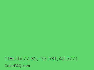 CIELab 77.35,-55.531,42.577 Color is a light green color and the nearest color is Emerald #50c878. Hex code #5fd76c and RGB value is rgb(95,215,108). In RGB color space, this color is composed of 37% red, 84% green, 42% blue, In CMYK color space, this color is composed of 56% cyan, 0% magenta, 50% yellow , 16% black , In HSL color space, this color has a hue angle of 127° , 60% saturation and 61% lightness.