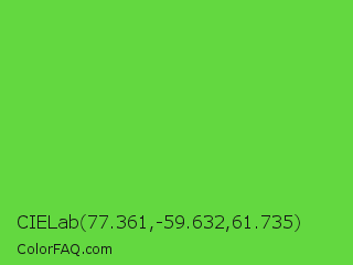 CIELab 77.361,-59.632,61.735 Color is a normal green color and the nearest color is Green RYB #66b032. Hex code #63d840 and RGB value is rgb(99,216,64). In RGB color space, this color is composed of 39% red, 85% green, 25% blue, In CMYK color space, this color is composed of 54% cyan, 0% magenta, 70% yellow , 15% black , In HSL color space, this color has a hue angle of 106° , 66% saturation and 55% lightness.
