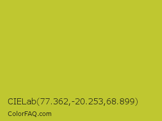 CIELab 77.362,-20.253,68.899 Color is a normal yellow color and the nearest color is Key Lime Pie #bfc921. Hex code #bfc730 and RGB value is rgb(191,199,48). In RGB color space, this color is composed of 75% red, 78% green, 19% blue, In CMYK color space, this color is composed of 4% cyan, 0% magenta, 76% yellow , 22% black , In HSL color space, this color has a hue angle of 63° , 61% saturation and 48% lightness.