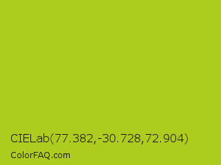 CIELab 77.382,-30.728,72.904 Color is a normal lime color and the nearest color is Acid Green #b0bf1a. Hex code #adcc1f and RGB value is rgb(173,204,31). In RGB color space, this color is composed of 68% red, 80% green, 12% blue, In CMYK color space, this color is composed of 15% cyan, 0% magenta, 85% yellow , 20% black , In HSL color space, this color has a hue angle of 71° , 74% saturation and 46% lightness.