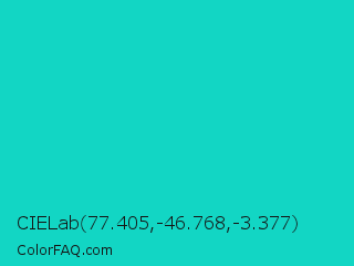 CIELab 77.405,-46.768,-3.377 Color is a normal cyan color and the nearest color is Robins Egg Blue #00cccc. Hex code #12d6c4 and RGB value is rgb(18,214,196). In RGB color space, this color is composed of 7% red, 84% green, 77% blue, In CMYK color space, this color is composed of 92% cyan, 0% magenta, 8% yellow , 16% black , In HSL color space, this color has a hue angle of 174° , 84% saturation and 45% lightness.