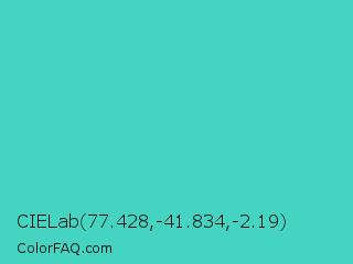 CIELab 77.428,-41.834,-2.19 Color is a normal cyan color and the nearest color is Medium Turquoise #48d1cc. Hex code #45d4c2 and RGB value is rgb(69,212,194). In RGB color space, this color is composed of 27% red, 83% green, 76% blue, In CMYK color space, this color is composed of 67% cyan, 0% magenta, 8% yellow , 17% black , In HSL color space, this color has a hue angle of 172° , 62% saturation and 55% lightness.