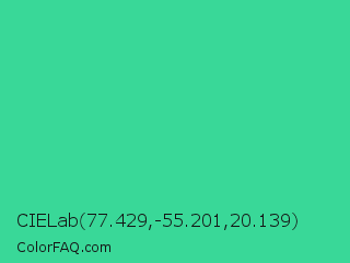CIELab 77.429,-55.201,20.139 Color is a normal green color and the nearest color is Shamrock #33cc99. Hex code #39d898 and RGB value is rgb(57,216,152). In RGB color space, this color is composed of 22% red, 85% green, 60% blue, In CMYK color space, this color is composed of 74% cyan, 0% magenta, 30% yellow , 15% black , In HSL color space, this color has a hue angle of 156° , 67% saturation and 54% lightness.