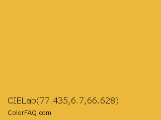 CIELab 77.435,6.7,66.628 Color is a normal orange color and the nearest color is Tulip Tree #eab33b. Hex code #ebb83b and RGB value is rgb(235,184,59). In RGB color space, this color is composed of 92% red, 72% green, 23% blue, In CMYK color space, this color is composed of 0% cyan, 22% magenta, 75% yellow , 8% black , In HSL color space, this color has a hue angle of 43° , 81% saturation and 58% lightness.