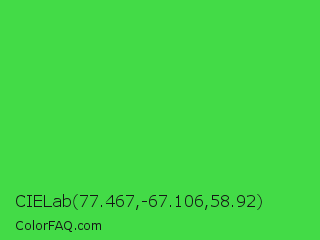 CIELab 77.467,-67.106,58.92 Color is a normal green color and the nearest color is Lime Green #32cd32. Hex code #43db47 and RGB value is rgb(67,219,71). In RGB color space, this color is composed of 26% red, 86% green, 28% blue, In CMYK color space, this color is composed of 69% cyan, 0% magenta, 68% yellow , 14% black , In HSL color space, this color has a hue angle of 122° , 68% saturation and 56% lightness.