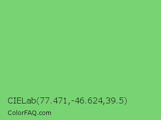 CIELab 77.471,-46.624,39.5 Color is a light green color and the nearest color is Pastel Green #77dd77. Hex code #78d473 and RGB value is rgb(120,212,115). In RGB color space, this color is composed of 47% red, 83% green, 45% blue, In CMYK color space, this color is composed of 43% cyan, 0% magenta, 46% yellow , 17% black , In HSL color space, this color has a hue angle of 117° , 53% saturation and 64% lightness.