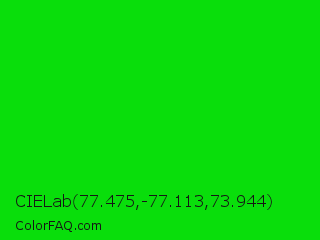 CIELab 77.475,-77.113,73.944 Color is a normal green color and the nearest color is Green #00ff00. Hex code #09de0b and RGB value is rgb(9,222,11). In RGB color space, this color is composed of 4% red, 87% green, 4% blue, In CMYK color space, this color is composed of 96% cyan, 0% magenta, 95% yellow , 13% black , In HSL color space, this color has a hue angle of 121° , 92% saturation and 45% lightness.