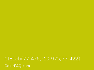 CIELab 77.476,-19.975,77.422 Color is a normal yellow color and the nearest color is Rio Grande #bbd009. Hex code #c2c705 and RGB value is rgb(194,199,5). In RGB color space, this color is composed of 76% red, 78% green, 2% blue, In CMYK color space, this color is composed of 3% cyan, 0% magenta, 97% yellow , 22% black , In HSL color space, this color has a hue angle of 62° , 95% saturation and 40% lightness.