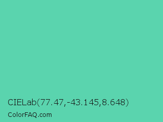 CIELab 77.47,-43.145,8.648 Color is a normal green color and the nearest color is Medium Aquamarine #66ddaa. Hex code #5ad4ae and RGB value is rgb(90,212,174). In RGB color space, this color is composed of 35% red, 83% green, 68% blue, In CMYK color space, this color is composed of 58% cyan, 0% magenta, 18% yellow , 17% black , In HSL color space, this color has a hue angle of 161° , 59% saturation and 59% lightness.