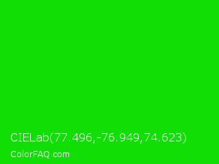 CIELab 77.496,-76.949,74.623 Color is a normal green color and the nearest color is Green #00ff00. Hex code #10de04 and RGB value is rgb(16,222,4). In RGB color space, this color is composed of 6% red, 87% green, 2% blue, In CMYK color space, this color is composed of 93% cyan, 0% magenta, 98% yellow , 13% black , In HSL color space, this color has a hue angle of 117° , 96% saturation and 44% lightness.