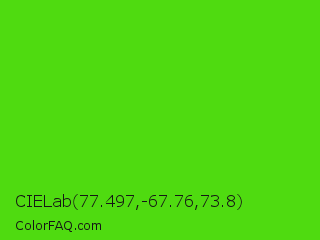 CIELab 77.497,-67.76,73.8 Color is a normal green color and the nearest color is Harlequin Green #46cb18. Hex code #4fdb10 and RGB value is rgb(79,219,16). In RGB color space, this color is composed of 31% red, 86% green, 6% blue, In CMYK color space, this color is composed of 64% cyan, 0% magenta, 93% yellow , 14% black , In HSL color space, this color has a hue angle of 101° , 86% saturation and 46% lightness.