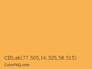 CIELab 77.505,16.325,58.515 Color is a light orange color and the nearest color is Casablanca #f8b853. Hex code #f8b250 and RGB value is rgb(248,178,80). In RGB color space, this color is composed of 97% red, 70% green, 31% blue, In CMYK color space, this color is composed of 0% cyan, 28% magenta, 68% yellow , 3% black , In HSL color space, this color has a hue angle of 35° , 92% saturation and 64% lightness.