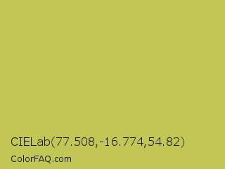 CIELab 77.508,-16.774,54.82 Color is a normal yellow color and the nearest color is Celery #b8c25d. Hex code #c1c655 and RGB value is rgb(193,198,85). In RGB color space, this color is composed of 76% red, 78% green, 33% blue, In CMYK color space, this color is composed of 3% cyan, 0% magenta, 57% yellow , 22% black , In HSL color space, this color has a hue angle of 63° , 50% saturation and 55% lightness.