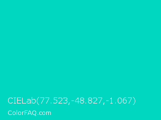 CIELab 77.523,-48.827,-1.067 Color is a normal cyan color and the nearest color is Robins Egg Blue #00cccc. Hex code #00d7c0 and RGB value is rgb(0,215,192). In RGB color space, this color is composed of 0% red, 84% green, 75% blue, In CMYK color space, this color is composed of 100% cyan, 0% magenta, 11% yellow , 16% black , In HSL color space, this color has a hue angle of 174° , 100% saturation and 42% lightness.