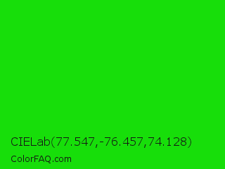 CIELab 77.547,-76.457,74.128 Color is a normal green color and the nearest color is Green #00ff00. Hex code #17de0a and RGB value is rgb(23,222,10). In RGB color space, this color is composed of 9% red, 87% green, 4% blue, In CMYK color space, this color is composed of 90% cyan, 0% magenta, 95% yellow , 13% black , In HSL color space, this color has a hue angle of 116° , 91% saturation and 45% lightness.
