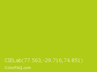 CIELab 77.563,-29.716,74.851 Color is a normal yellow color and the nearest color is La Rioja #b3c110. Hex code #b0cc16 and RGB value is rgb(176,204,22). In RGB color space, this color is composed of 69% red, 80% green, 9% blue, In CMYK color space, this color is composed of 14% cyan, 0% magenta, 89% yellow , 20% black , In HSL color space, this color has a hue angle of 69° , 81% saturation and 44% lightness.