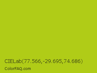 CIELab 77.566,-29.695,74.686 Color is a normal yellow color and the nearest color is Acid Green #b0bf1a. Hex code #b0cc17 and RGB value is rgb(176,204,23). In RGB color space, this color is composed of 69% red, 80% green, 9% blue, In CMYK color space, this color is composed of 14% cyan, 0% magenta, 89% yellow , 20% black , In HSL color space, this color has a hue angle of 69° , 80% saturation and 45% lightness.