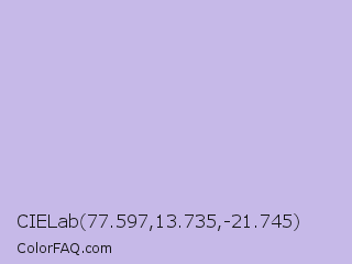 CIELab 77.597,13.735,-21.745 Color is a very light indigo color and the nearest color is Prelude #d0c0e5. Hex code #c6b9e8 and RGB value is rgb(198,185,232). In RGB color space, this color is composed of 78% red, 73% green, 91% blue, In CMYK color space, this color is composed of 15% cyan, 20% magenta, 0% yellow , 9% black , In HSL color space, this color has a hue angle of 257° , 51% saturation and 82% lightness.