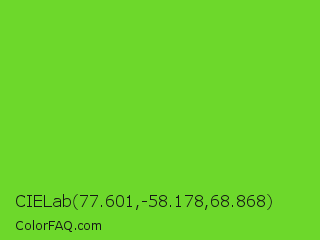 CIELab 77.601,-58.178,68.868 Color is a normal green color and the nearest color is Lima #76bd17. Hex code #6dd82b and RGB value is rgb(109,216,43). In RGB color space, this color is composed of 43% red, 85% green, 17% blue, In CMYK color space, this color is composed of 50% cyan, 0% magenta, 80% yellow , 15% black , In HSL color space, this color has a hue angle of 97° , 69% saturation and 51% lightness.