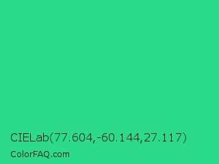 CIELab 77.604,-60.144,27.117 Color is a normal green color and the nearest color is Shamrock #33cc99. Hex code #2cda8b and RGB value is rgb(44,218,139). In RGB color space, this color is composed of 17% red, 85% green, 55% blue, In CMYK color space, this color is composed of 80% cyan, 0% magenta, 36% yellow , 15% black , In HSL color space, this color has a hue angle of 153° , 70% saturation and 51% lightness.