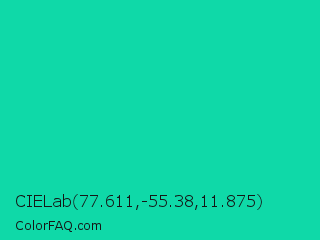 CIELab 77.611,-55.38,11.875 Color is a normal cyan color and the nearest color is Caribbean Green #00cc99. Hex code #0fd9a8 and RGB value is rgb(15,217,168). In RGB color space, this color is composed of 6% red, 85% green, 66% blue, In CMYK color space, this color is composed of 93% cyan, 0% magenta, 23% yellow , 15% black , In HSL color space, this color has a hue angle of 165° , 87% saturation and 45% lightness.