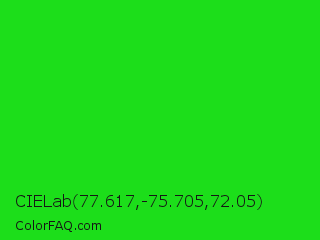 CIELab 77.617,-75.705,72.05 Color is a normal green color and the nearest color is Lime Green #32cd32. Hex code #1cde1a and RGB value is rgb(28,222,26). In RGB color space, this color is composed of 11% red, 87% green, 10% blue, In CMYK color space, this color is composed of 87% cyan, 0% magenta, 88% yellow , 13% black , In HSL color space, this color has a hue angle of 119° , 79% saturation and 49% lightness.
