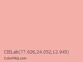 CIELab 77.626,24.052,12.945 Color is a very light red color and the nearest color is Rose Bud #fbb2a3. Hex code #f3afa9 and RGB value is rgb(243,175,169). In RGB color space, this color is composed of 95% red, 69% green, 66% blue, In CMYK color space, this color is composed of 0% cyan, 28% magenta, 30% yellow , 5% black , In HSL color space, this color has a hue angle of 5° , 76% saturation and 81% lightness.