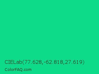 CIELab 77.628,-62.818,27.619 Color is a normal green color and the nearest color is Caribbean Green #00cc99. Hex code #0ddb8a and RGB value is rgb(13,219,138). In RGB color space, this color is composed of 5% red, 86% green, 54% blue, In CMYK color space, this color is composed of 94% cyan, 0% magenta, 37% yellow , 14% black , In HSL color space, this color has a hue angle of 156° , 89% saturation and 45% lightness.