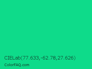 CIELab 77.633,-62.78,27.626 Color is a normal green color and the nearest color is Caribbean Green #00cc99. Hex code #0edb8a and RGB value is rgb(14,219,138). In RGB color space, this color is composed of 5% red, 86% green, 54% blue, In CMYK color space, this color is composed of 94% cyan, 0% magenta, 37% yellow , 14% black , In HSL color space, this color has a hue angle of 156° , 88% saturation and 46% lightness.