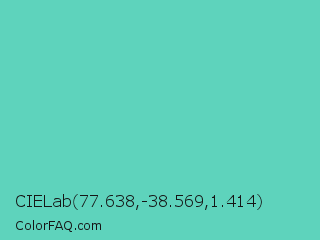 CIELab 77.638,-38.569,1.414 Color is a normal cyan color and the nearest color is Downy #6fd0c5. Hex code #5ed3bc and RGB value is rgb(94,211,188). In RGB color space, this color is composed of 37% red, 83% green, 74% blue, In CMYK color space, this color is composed of 55% cyan, 0% magenta, 11% yellow , 17% black , In HSL color space, this color has a hue angle of 168° , 57% saturation and 60% lightness.