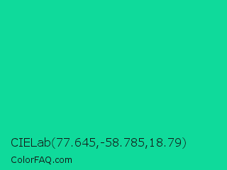 CIELab 77.645,-58.785,18.79 Color is a normal green color and the nearest color is Caribbean Green #00cc99. Hex code #0fda9b and RGB value is rgb(15,218,155). In RGB color space, this color is composed of 6% red, 85% green, 61% blue, In CMYK color space, this color is composed of 93% cyan, 0% magenta, 29% yellow , 15% black , In HSL color space, this color has a hue angle of 161° , 87% saturation and 46% lightness.
