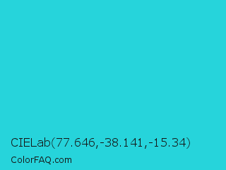 CIELab 77.646,-38.141,-15.34 Color is a normal cyan color and the nearest color is Turquoise PWG #30d5c8. Hex code #26d4db and RGB value is rgb(38,212,219). In RGB color space, this color is composed of 15% red, 83% green, 86% blue, In CMYK color space, this color is composed of 83% cyan, 3% magenta, 0% yellow , 14% black , In HSL color space, this color has a hue angle of 182° , 72% saturation and 50% lightness.