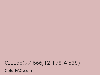 CIELab 77.666,12.178,4.538 Color is a light red color and the nearest color is Blossom #dcb4bc. Hex code #dab8b8 and RGB value is rgb(218,184,184). In RGB color space, this color is composed of 85% red, 72% green, 72% blue, In CMYK color space, this color is composed of 0% cyan, 16% magenta, 16% yellow , 15% black , In HSL color space, this color has a hue angle of 0° , 31% saturation and 79% lightness.