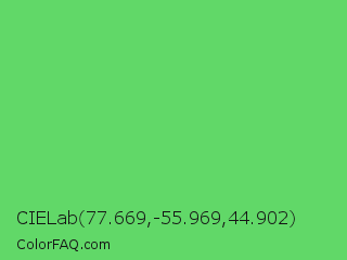 CIELab 77.669,-55.969,44.902 Color is a light green color and the nearest color is Pastel Green #77dd77. Hex code #61d868 and RGB value is rgb(97,216,104). In RGB color space, this color is composed of 38% red, 85% green, 41% blue, In CMYK color space, this color is composed of 55% cyan, 0% magenta, 52% yellow , 15% black , In HSL color space, this color has a hue angle of 124° , 60% saturation and 61% lightness.