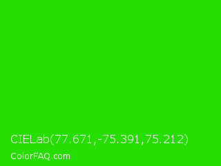 CIELab 77.671,-75.391,75.212 Color is a normal green color and the nearest color is Harlequin #3fff00. Hex code #26de00 and RGB value is rgb(38,222,0). In RGB color space, this color is composed of 15% red, 87% green, 0% blue, In CMYK color space, this color is composed of 83% cyan, 0% magenta, 100% yellow , 13% black , In HSL color space, this color has a hue angle of 110° , 100% saturation and 44% lightness.