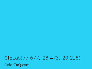 CIELab 77.677,-28.473,-29.218 Color is a normal cyan color and the nearest color is Spiro Disco Ball #0fc0fc. Hex code #29d1f5 and RGB value is rgb(41,209,245). In RGB color space, this color is composed of 16% red, 82% green, 96% blue, In CMYK color space, this color is composed of 83% cyan, 15% magenta, 0% yellow , 4% black , In HSL color space, this color has a hue angle of 191° , 91% saturation and 56% lightness.